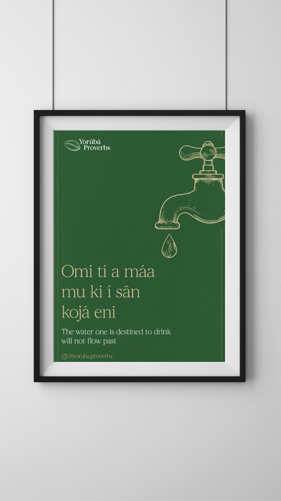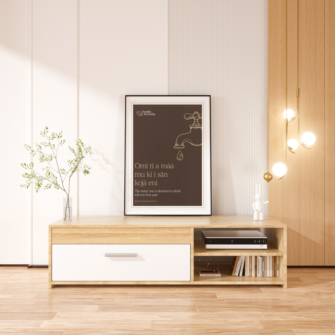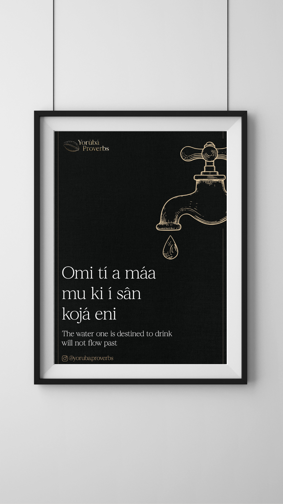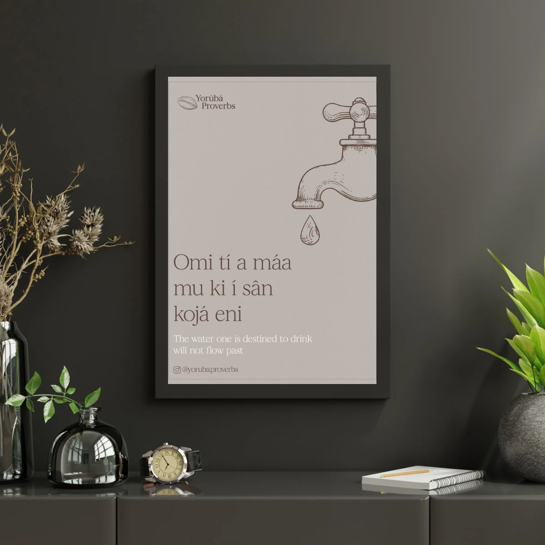 Take in the profound message of the Yoruba proverb - "The water one is destined to drink will not flow past" - with our distinct Yoruba Proverb Poster, available in 4 colors and 3 sizes! Frame not included.